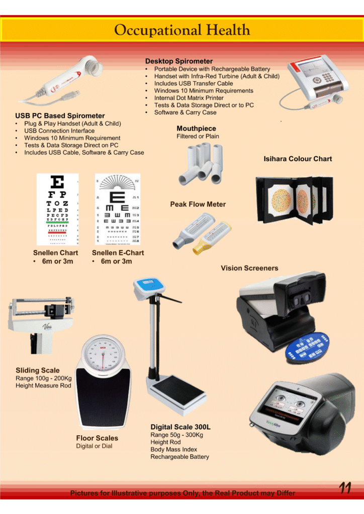 - Occupational Health Equipment, Vision screener, Spirometer, height meter etc.